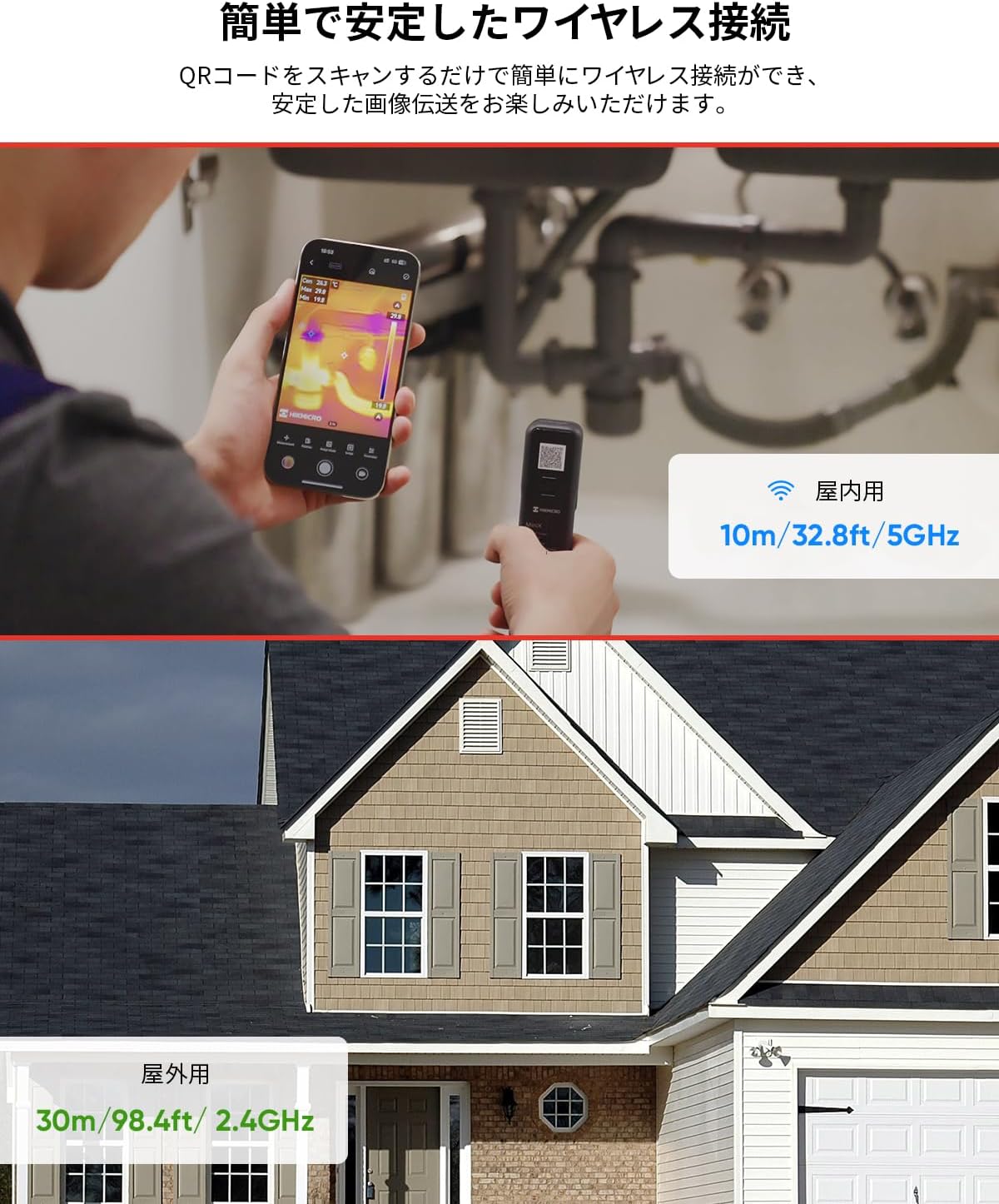 【安定した無線接続と幅広い互換性】Mini-X無線接続赤外線サーマルカメラは、AndroidまたはiOSデバイスとシームレスに動作するため、携帯電話の機種変更時にカメラを交換する必要がありません。 2.4GHzと5GHzの両方に対応しているため、ネットワーク接続の継続性と安定性が保証されます。 ワイヤレス伝送範囲は、屋外では最大30メートル、屋内では最大10メートルで、遅延は非常に小さくなっています。QRコードをスキャンするだけで 簡単に無線接続でき、狭い場所や隅でも鮮明な赤外線画像を見ることができます。