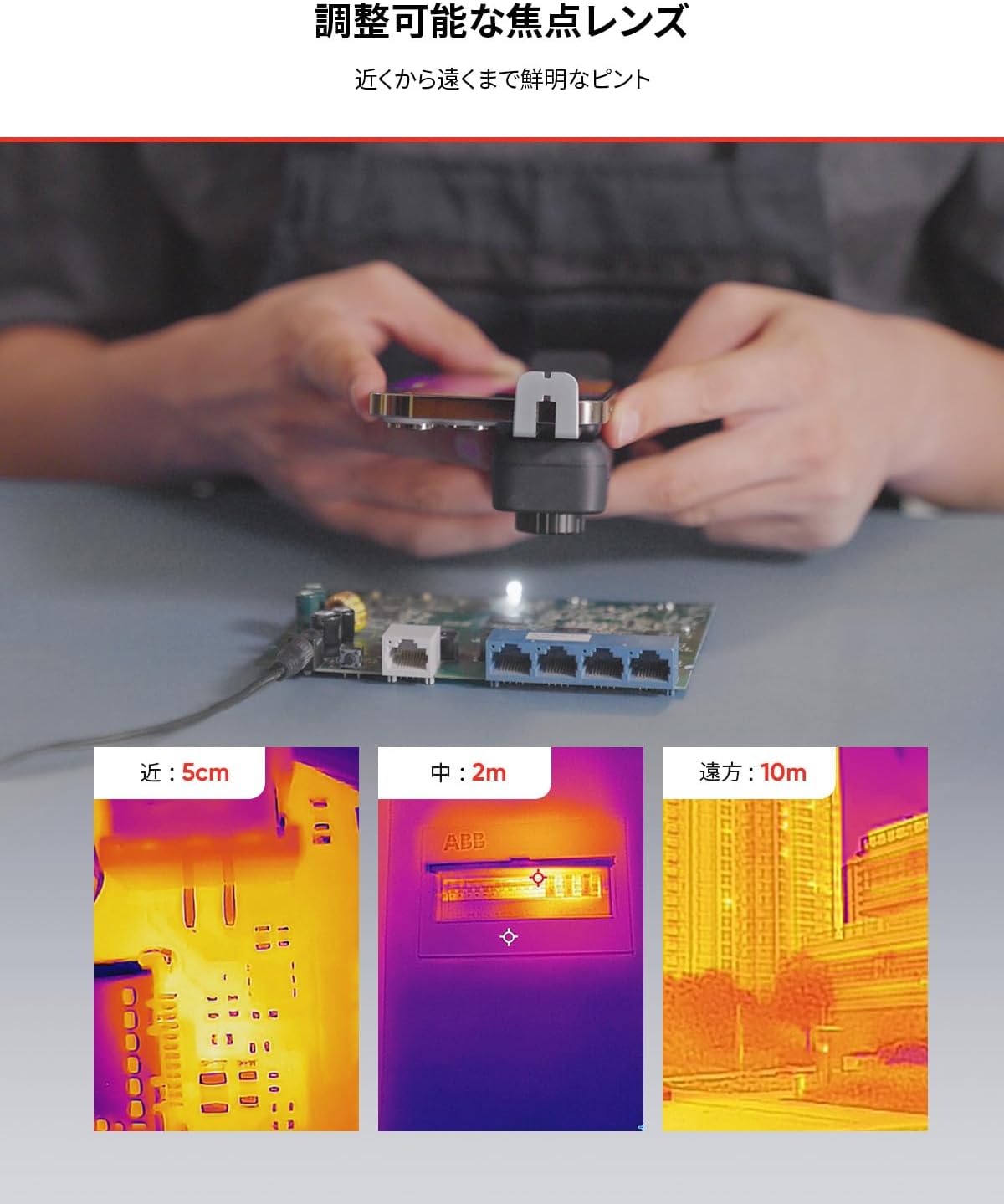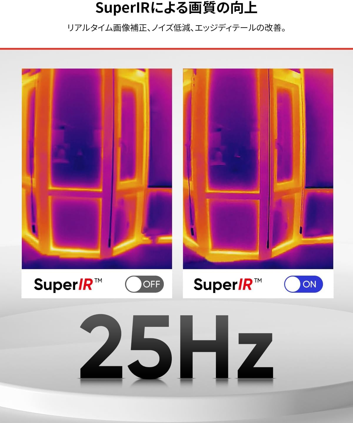 【SuperIR、デュアルカメラ】赤外線サーマルカメラMini-Xは、SuperIRアルゴリズムによるリアルタイム画像補正により、検出素子の解像度を256x192から640x480の驚異的な画像解像度に向上させています。 赤外線カメラと可視カメラを内蔵し、5つの画像モード(可視/赤外線/フュージョン/PIP/ハイブリッド)で、読み取り不可能なタグ情報や目に見えない画像エッジの詳細を表示します。 このカメラは、シャープネス、コントラスト、明るさなどを調整しながら、25Hzのスムーズでタイムラグのない画像処理を実現します。