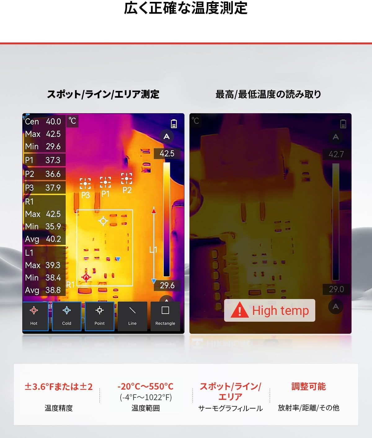【強力なアプリとソフトウェア】 iOSとAndroid用のHIKMICRO Viewerアプリを使用すると、ファームウェアのアップグレード、熱画像のキャプチャとビデオの記録、熱画像設定の調整、熱画像の分析、結果の注釈、インスタントレポートの作成ができます。 Windows用のHIKMICRO Analyzer PCソフトウェアは、リアルタイムの温度折れ線グラフ、2D/3D温度マップ、およびパーソナライズされたプロフェッショナルレポートを提供します。 Windows用PCソフトウェアHIKMICRO Analyzerは、リアルタイムの温度折れ線グラフ、2D/3D温度マップ、個人用の専門的なレポートを提供します。 これらの無料かつ強力なツールは、効率的な熱データ解析と結果の効果的なプレゼンテーションを可能にします。