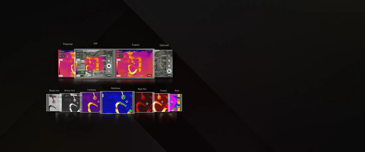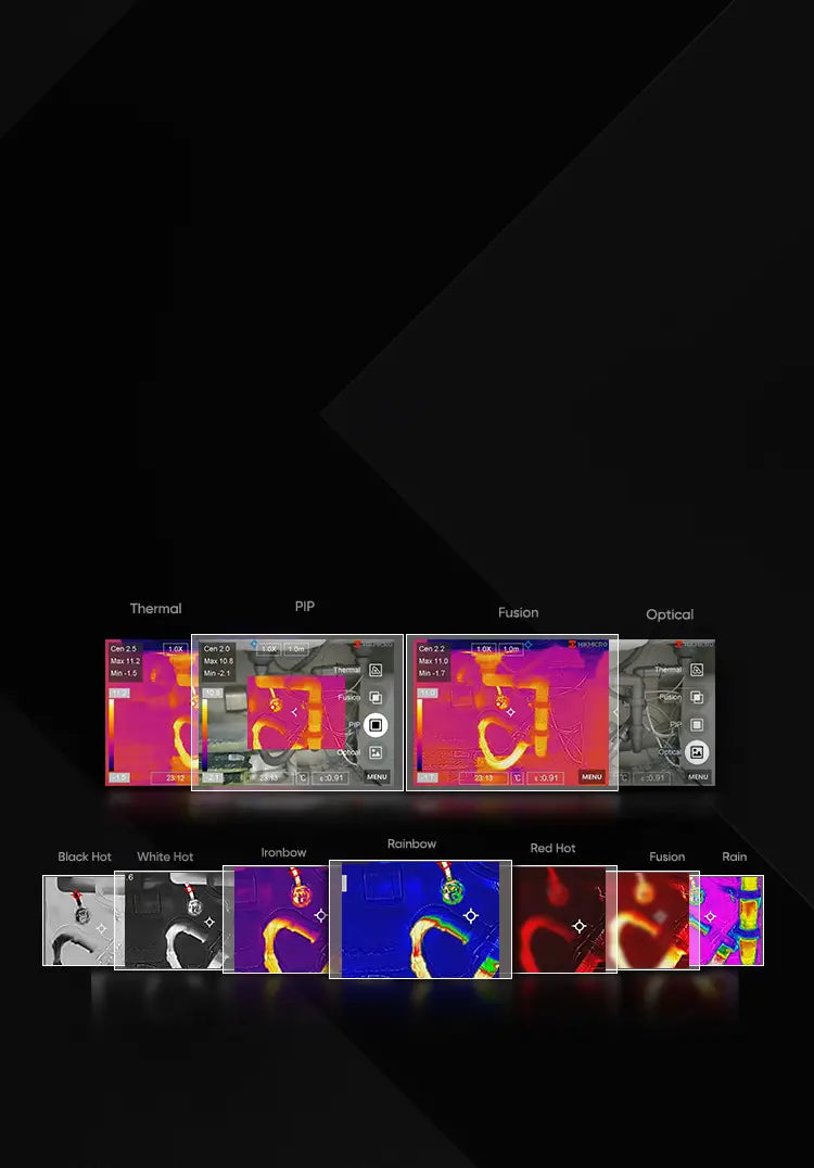 【効率温度設定】:フルスクリーンにはセンタースポット、ホットスポット、コールドスポットの温度を自動的に追跡します。サーマル、バイスペクトル画像融合、PIP と対話光モード、4 種類の画像モードに対応できます。作業員に自信で詳細な画像を提供し、問題の早期発見につながります。