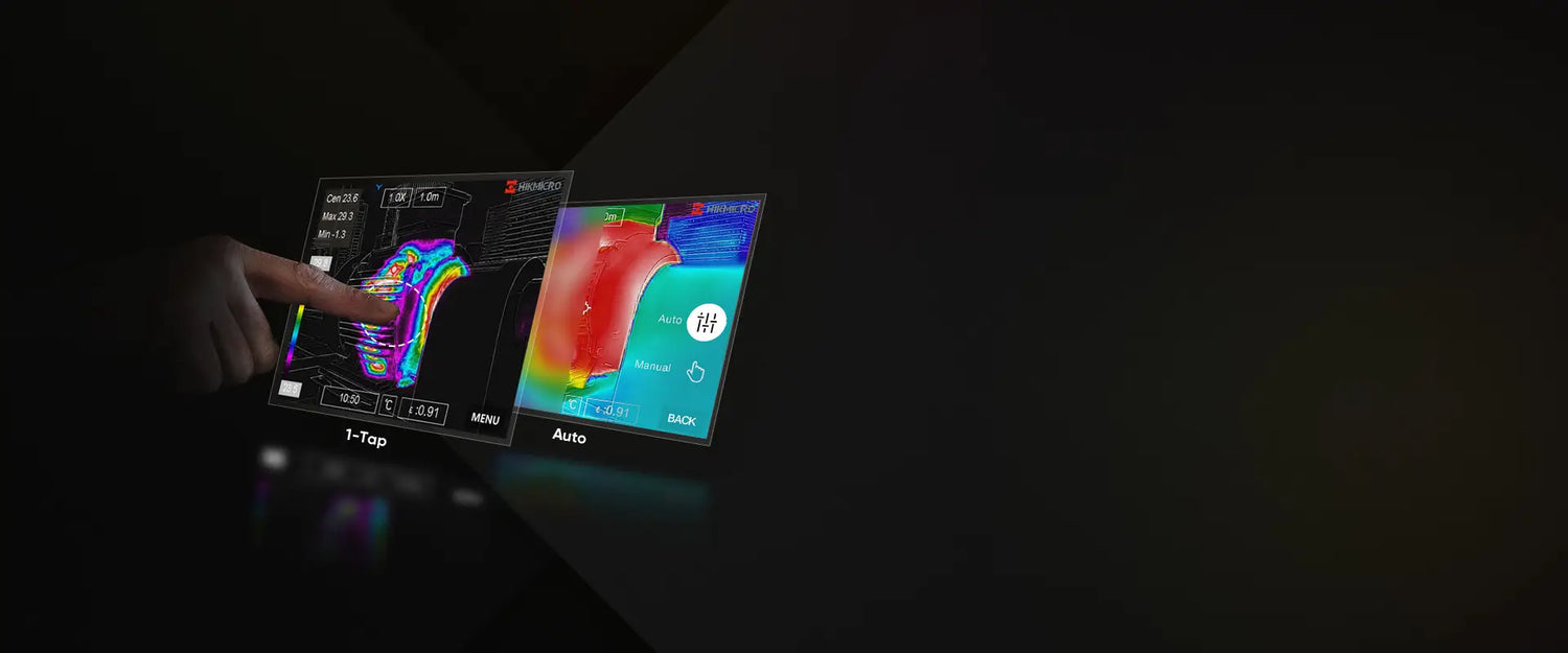 【1-タップレベルとスパン】:フォーカスしたい設定箇所をデイスプレー上でタッチするだけで最適な温度範囲の設定が完了です。画像のコントラストを改善し、潜在的な問題を浮き彫りにすることができます温度範囲の最高温度と最低温度を手動でカスターム設定することもできます。